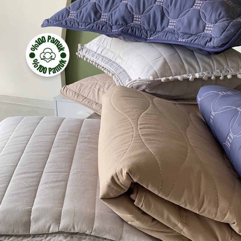 Doğal pamuk kumaşı cilt dostu yapı sunarken, kapitoneli dikişleri sayesinde hem dekoratif hem de sıcak tutan bir deneyim sağlar.
