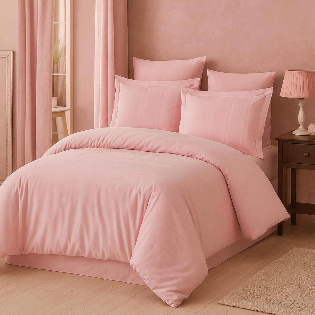 1 adet çift kişilik lastiksiz çarşaf, 1 adet nevresim, 4 adet yastık kılıfı ( 2 düz + 2 desenli )