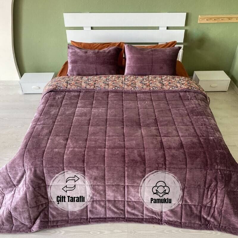 Üç farklı desenle çift taraflı kullanılabilen yorgan tasarımı, yatak odanıza her gün farklı bir atmosfer kazandırır. %100 Pamuk iç yüzey kumaşı nefes alabilir, cilde dosttur ve terletmeyen özelliğiyle 4 mevsim ideal kullanım sağlar. Orta kalınlıkta iç dolgusu sayesinde sıcaklık hissini uzun süre korur.