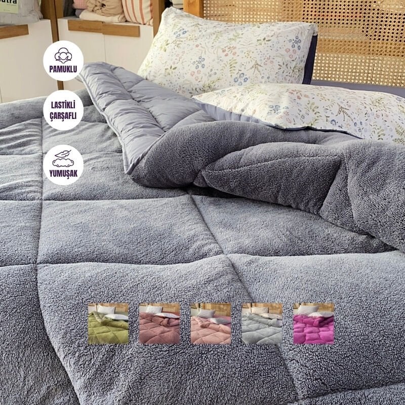 Çift Kişilik Sette; 1 adet çift kişilik lastikli çarşaf, 1 adet çift kişilik yorgan, 2 adet yastık kılıfı